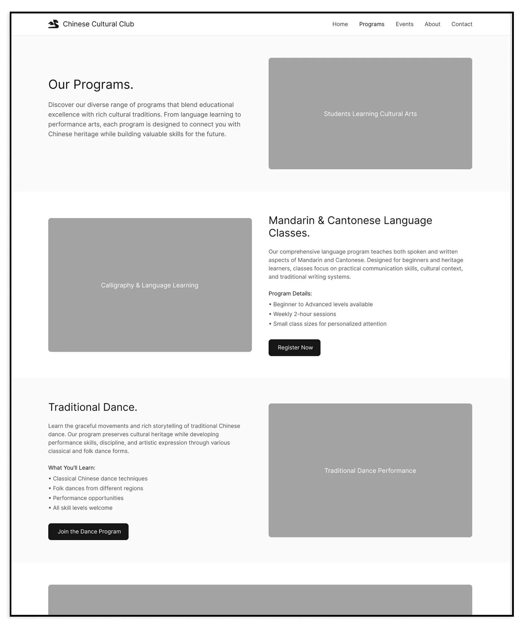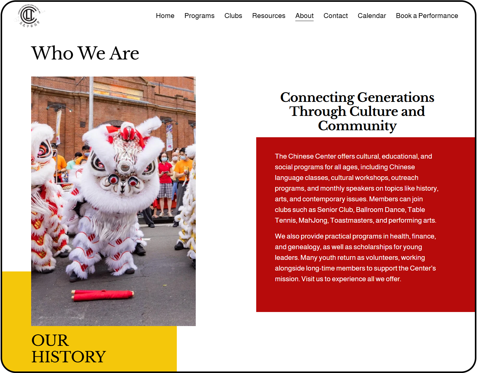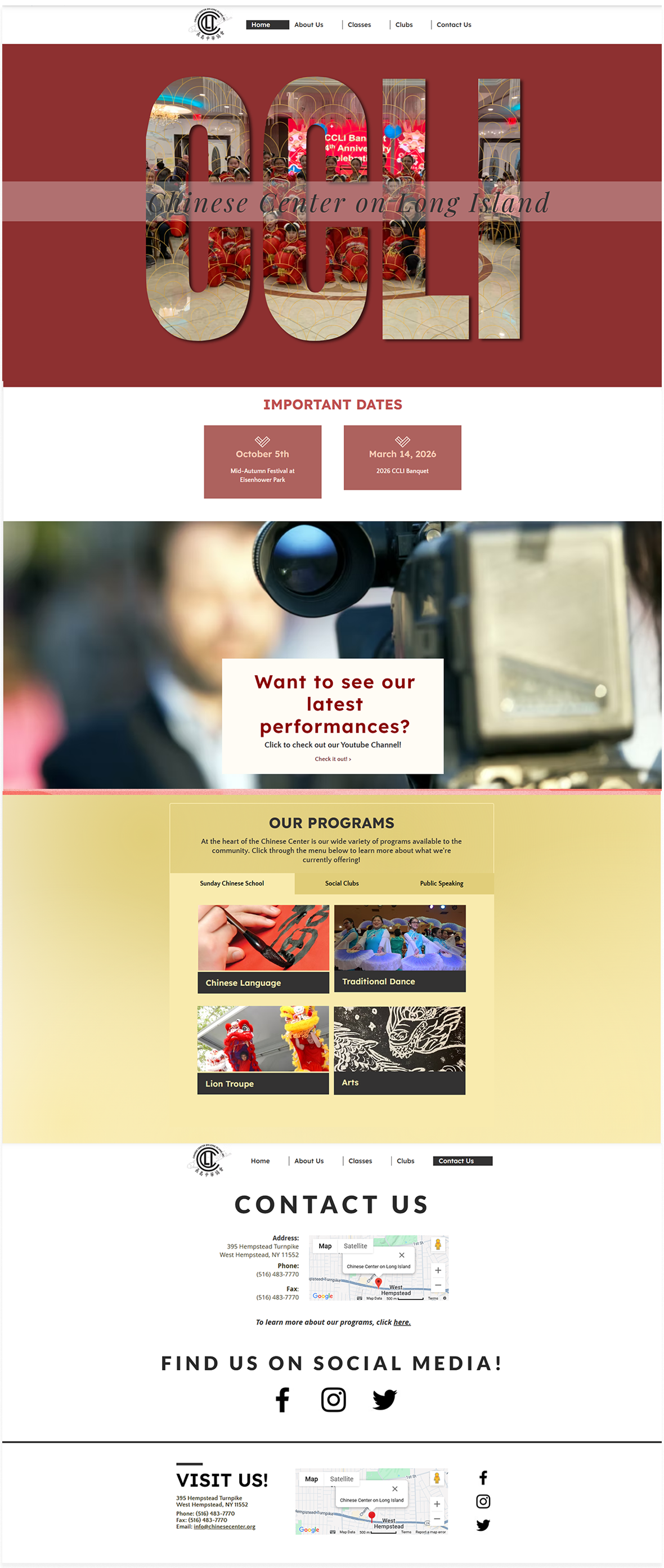 The primary goal of this redesign was to improve user engagement and communication by creating a visually inviting, easy-to-navigate platform that serves students, families, and community members alike. The project aimed to modernize the organization’s digital presence, enhance usability across devices, and strengthen the emotional connection between visitors and the community. Ultimately, the redesign supports the Chinese Center of Long Island’s mission by making its programs more accessible, its story more visible, and its identity more cohesive.