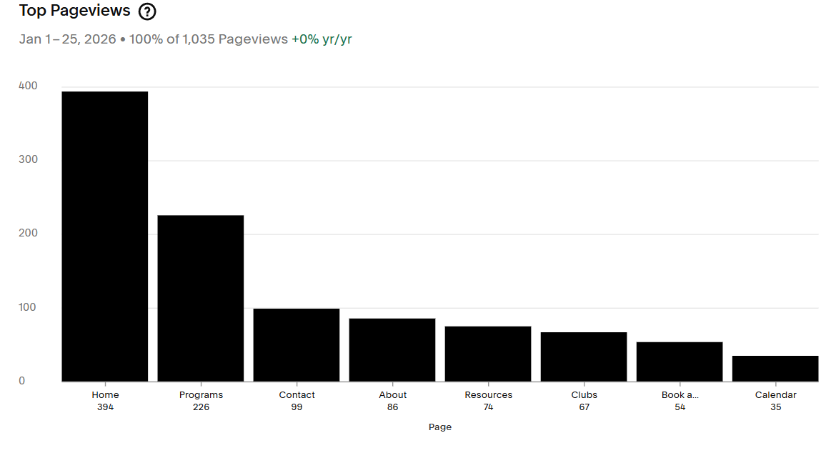 Early analytics revealed strong traffic to Programs and Contact pages, confirming that the redesigned information architecture successfully guided users to key actions.