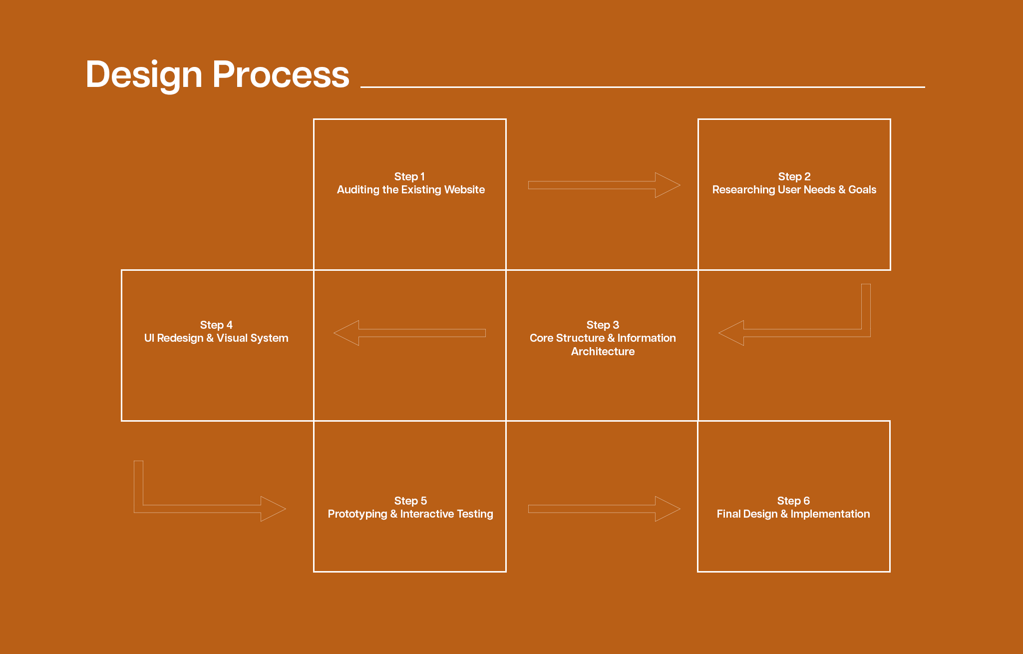The redesign began with an audit and user research, followed by a restructured information architecture, a refreshed visual system, and prototype testing to ensure clarity, accessibility, and responsiveness before launch.